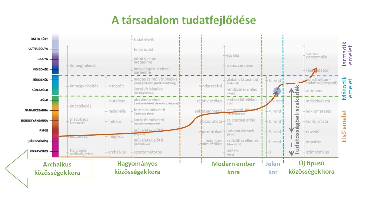 Ebben az átmeneti korban nyílt először lehetőségünk, hogy a csupán egocentrikus tudatossági szintekről (első emelet) tovább lépjünk az egocentrikus tudatosságot meghaladó szintekre (második emelet). Ez teszi lehetővé, hogy ma képesek vagyunk új típusú, tudatosság alapú közösségeket létrehozni.