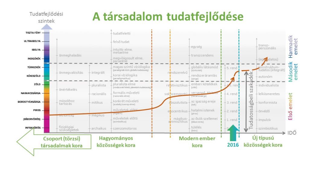 Fontos felismerés volt a számomra amikor rájöttem, hogy a társadalomnak – mint élőrendszernek – ugyanúgy lehet tudatfejlődése, mint az egyénnek. Ennek emelkedését rajzoltam az ábrán narancssárga vonallal**. Lényegében ekkor tudatosult bennem, hogy a hagyományos közösségek szétesése, és a modern kor elidegenedett, individuális társadalma a társadalmi tudatfejlődés miatt törvényszerű volt. Azaz nem elrontottunk valamit, nem zsákutcába kerültünk, és nem mi vagyunk a Földön a rákos daganat, hanem csupán fejlődtünk. Még akkor is, ha ezt nehéz fejlődésként értelmezni.